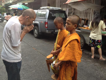 Tidligt om morgenen gik de små munkedrenge rundt i byen med deres madskåle.